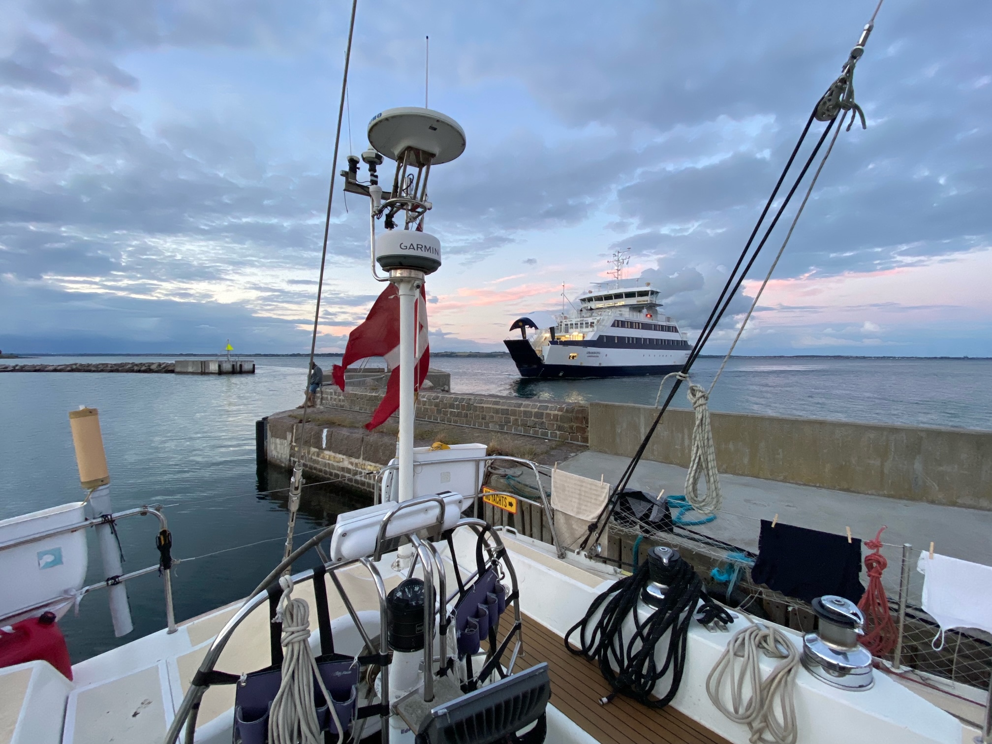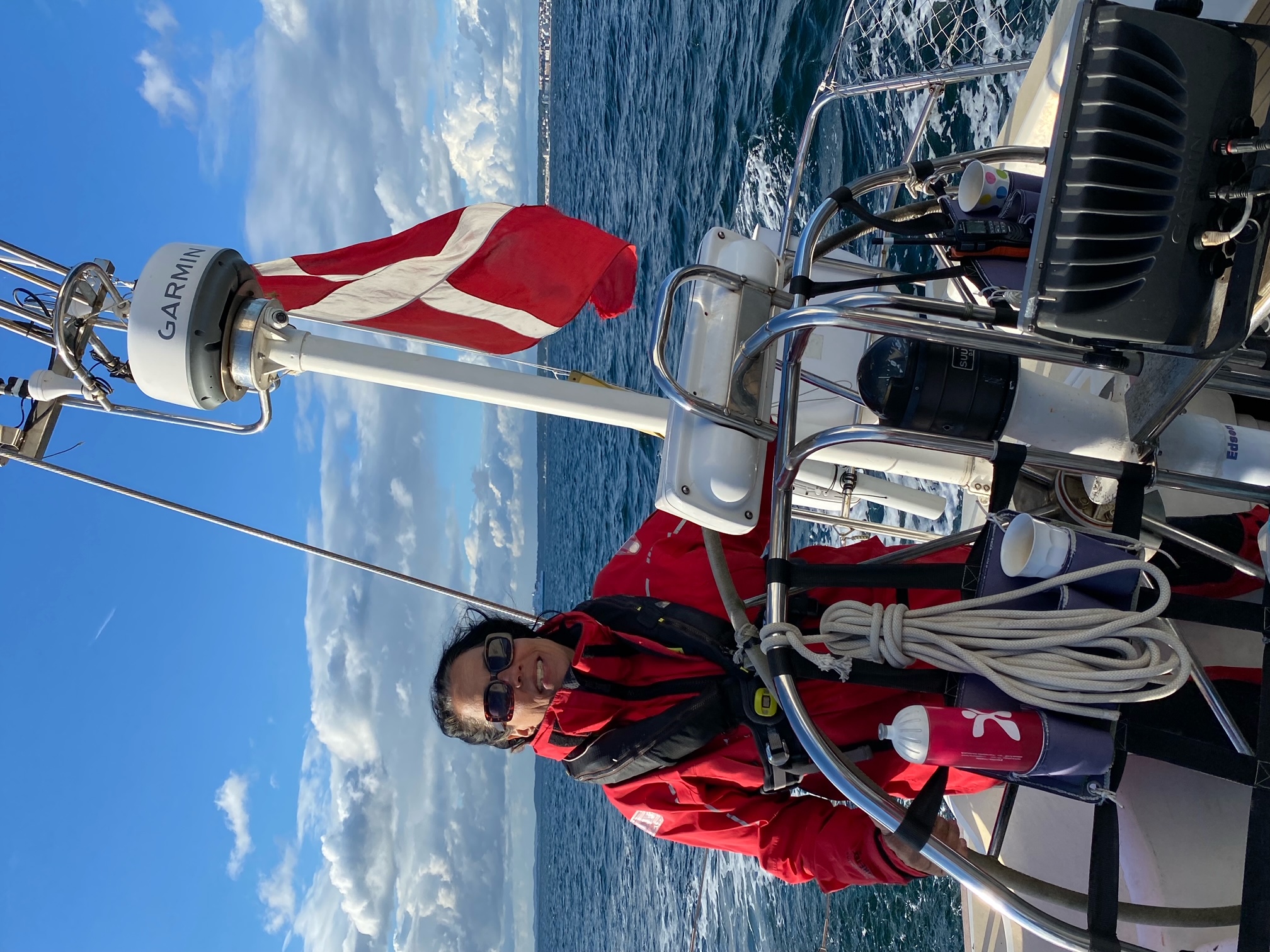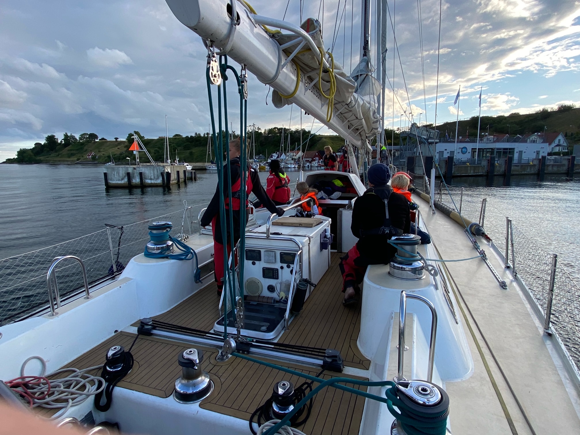 Vi ligger nu smukt i hjertet af Øresund. Godt vindblæste efter at være fløjet ned gennem sundet. Nu sidder vi nu og nyder kaptajnens pandekager og synger fællessang.