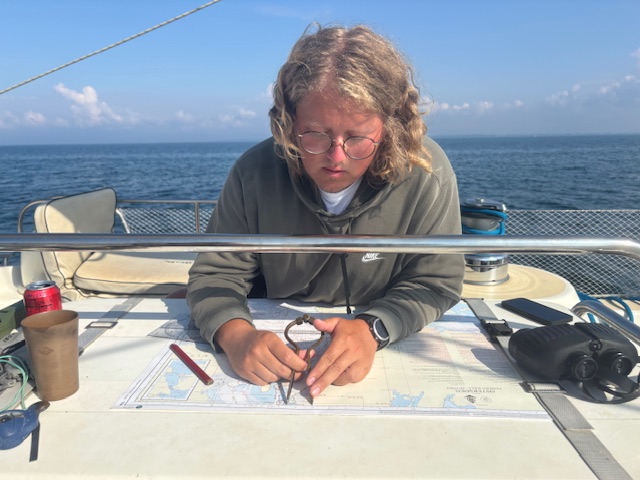 På dækket havde gasten med ankervagten fundet et søkort frem, hvor den vågne besætning blev undervist i koordinater og der blev tegnet ind på kortet for at se hvor båden lå, hvilken kurs vi skulle bruge ind til Køge og hvor mange sømil der var.