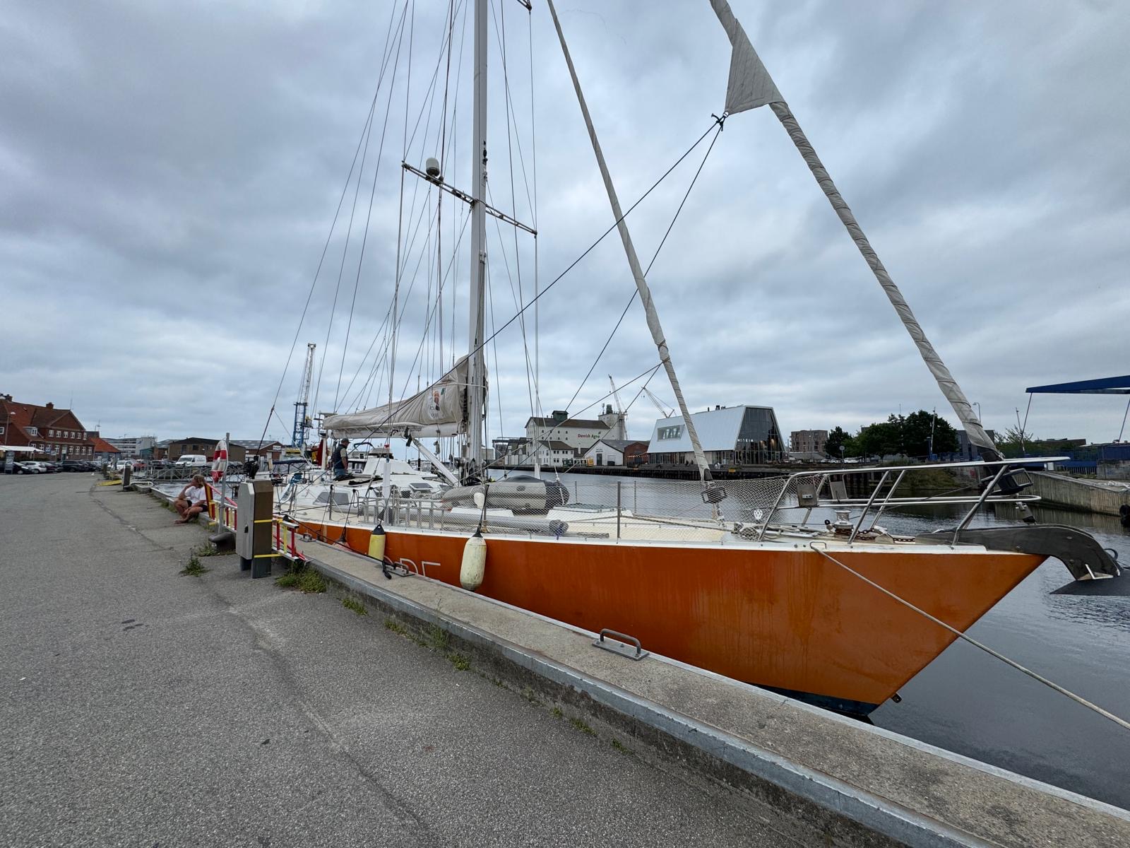 I Køge fik vi en fin plads lige midt på havnen med det lokale bryghus på den ene side og restauranter og musik på den anden.