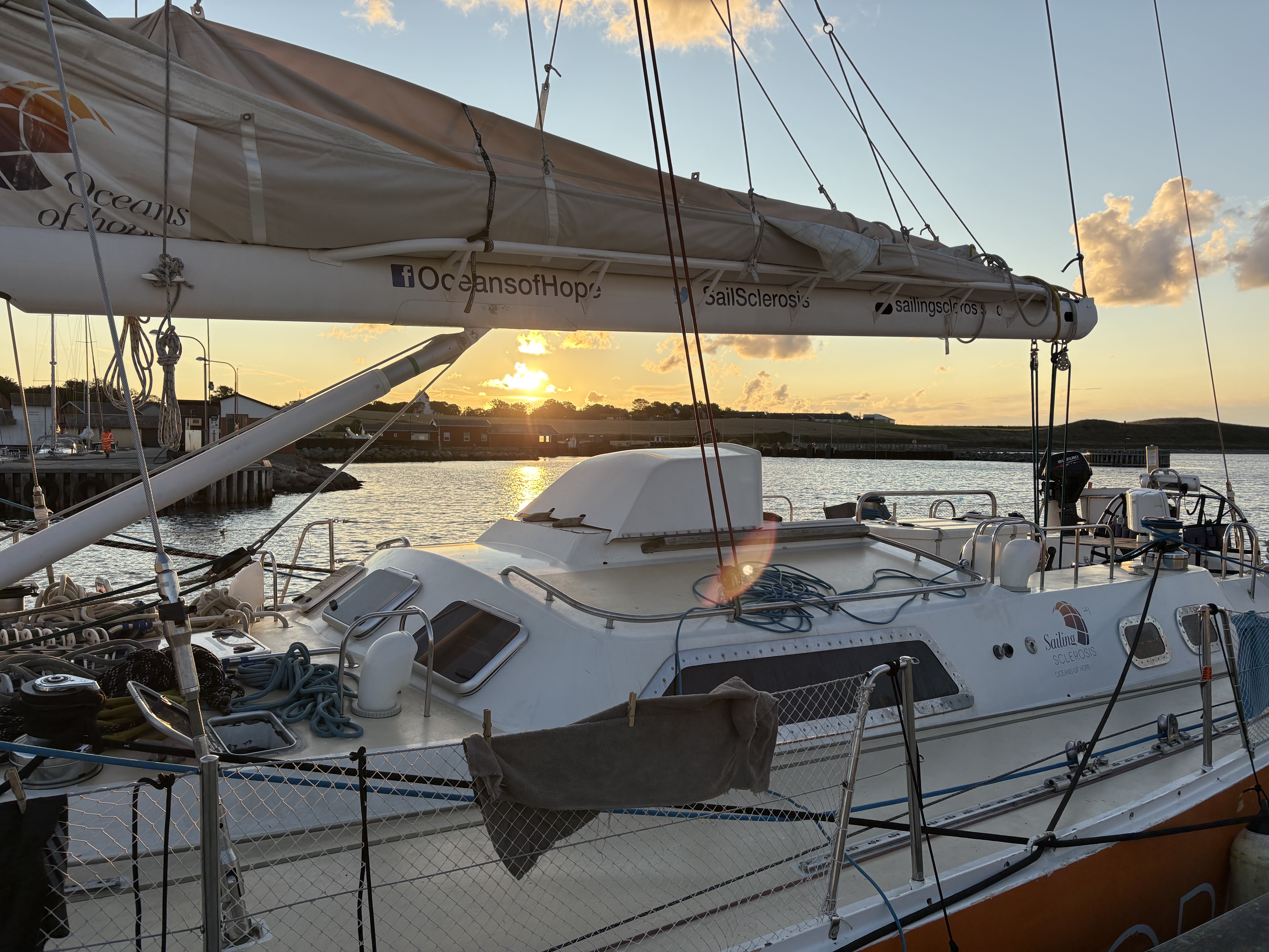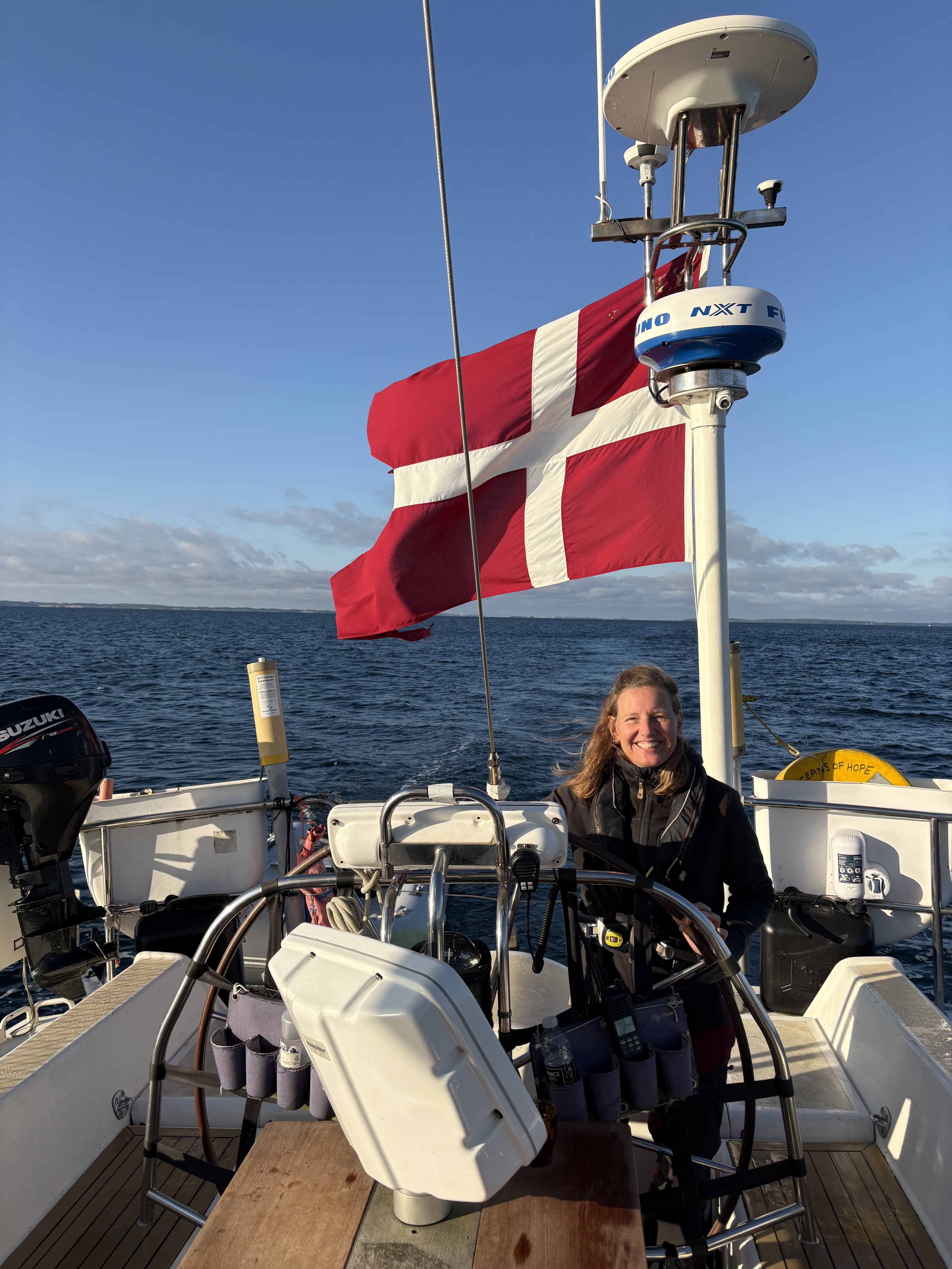 En noget kortere, men lige så skøn, dagsetape sluttede med Skipper Mathis’ flotte demonstration af, hvordan man bakker Oceans of Hope ind i Ballen Havn, hvilket blev anerkendt med et flot fyrværkeri styret gævt af matros Lykke.