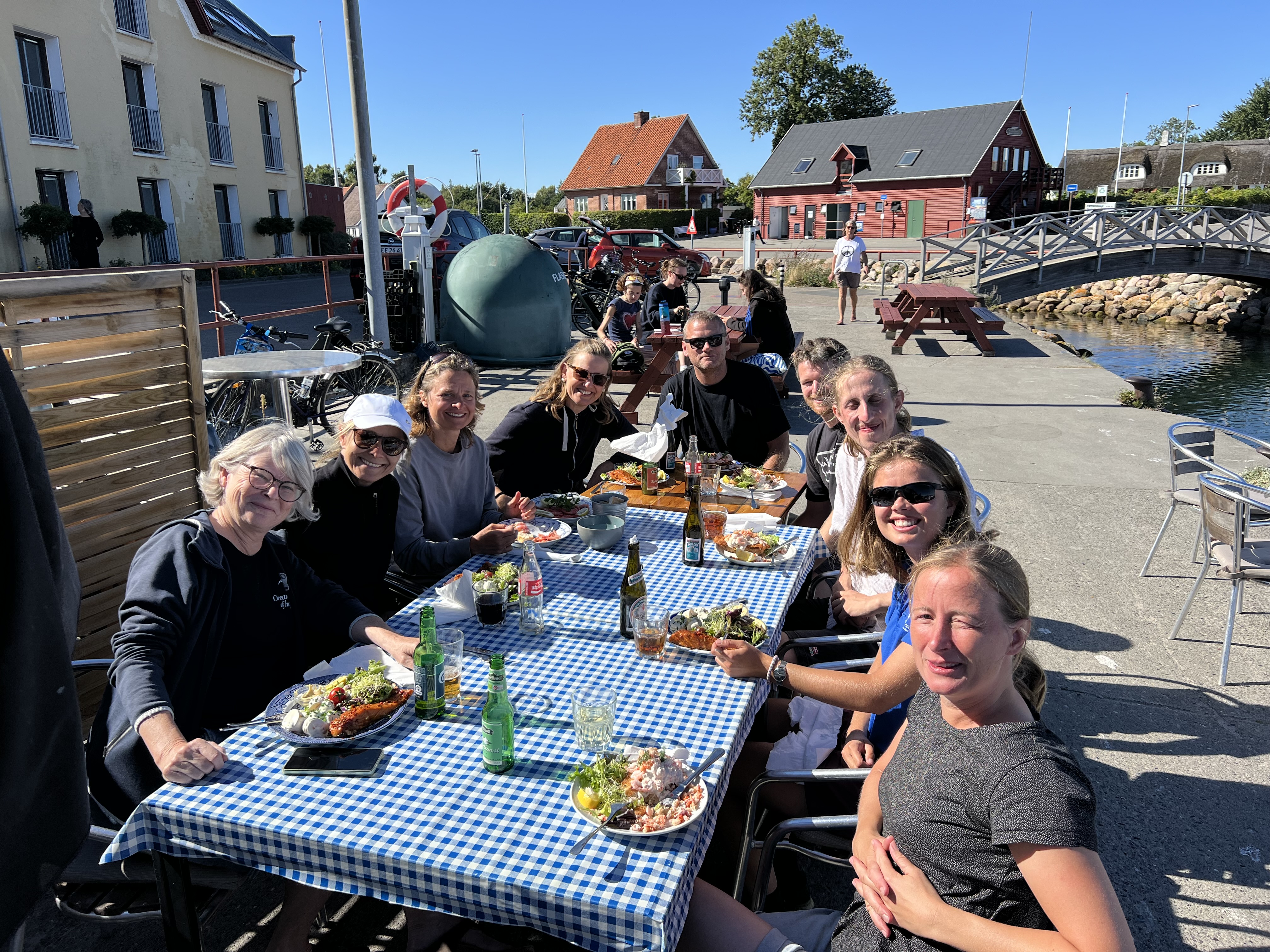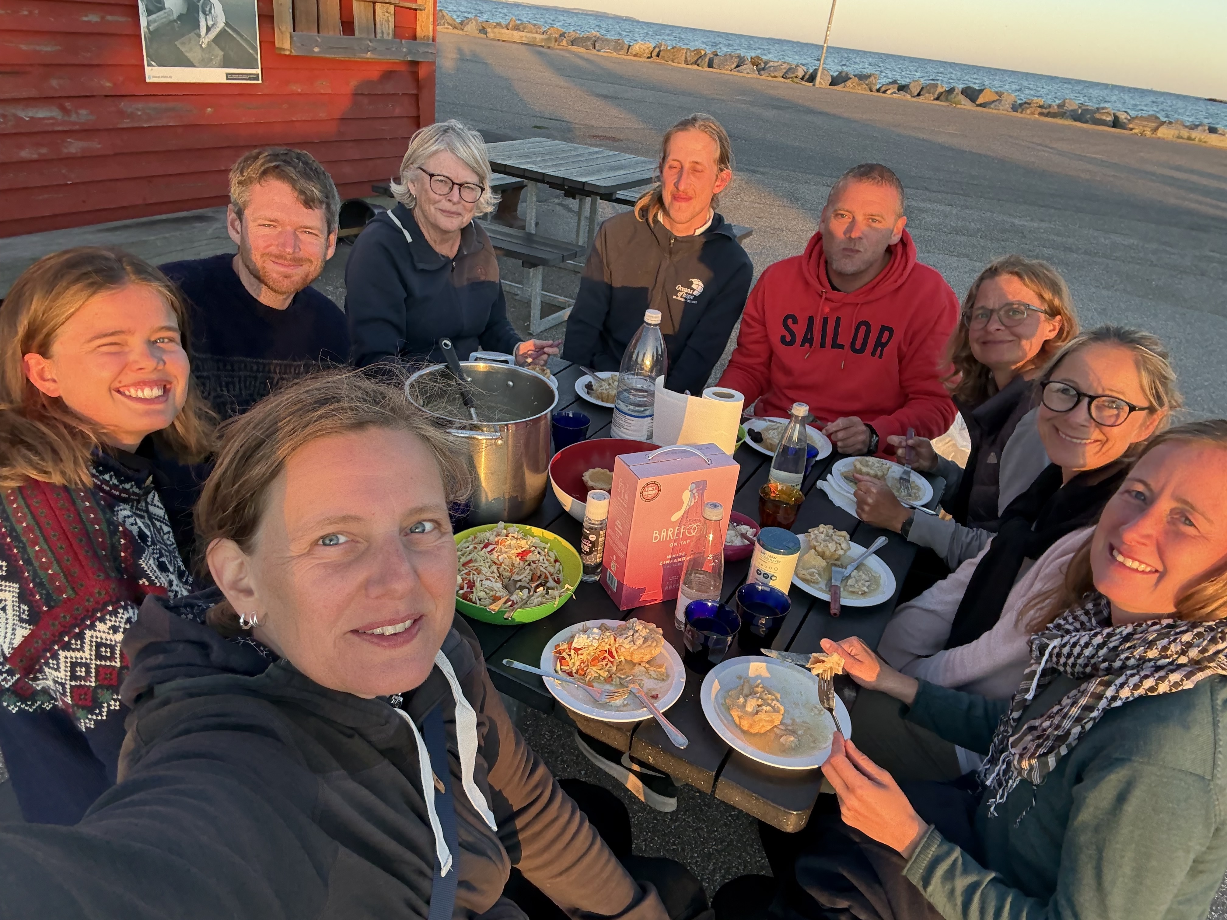 Så var der ellers fri leg, så nogle tjekkede Røde Kors butikken ud, tre friske frømænd hoppede i våddragter og tog en tjans med at skrabe alger og ruer af båden, mens køkkenholdet lavede lækre tarteletter til en rigtig hyggelig aftenpicnic på havnen afsluttende med lagkage-fejring af diverse årsdage.