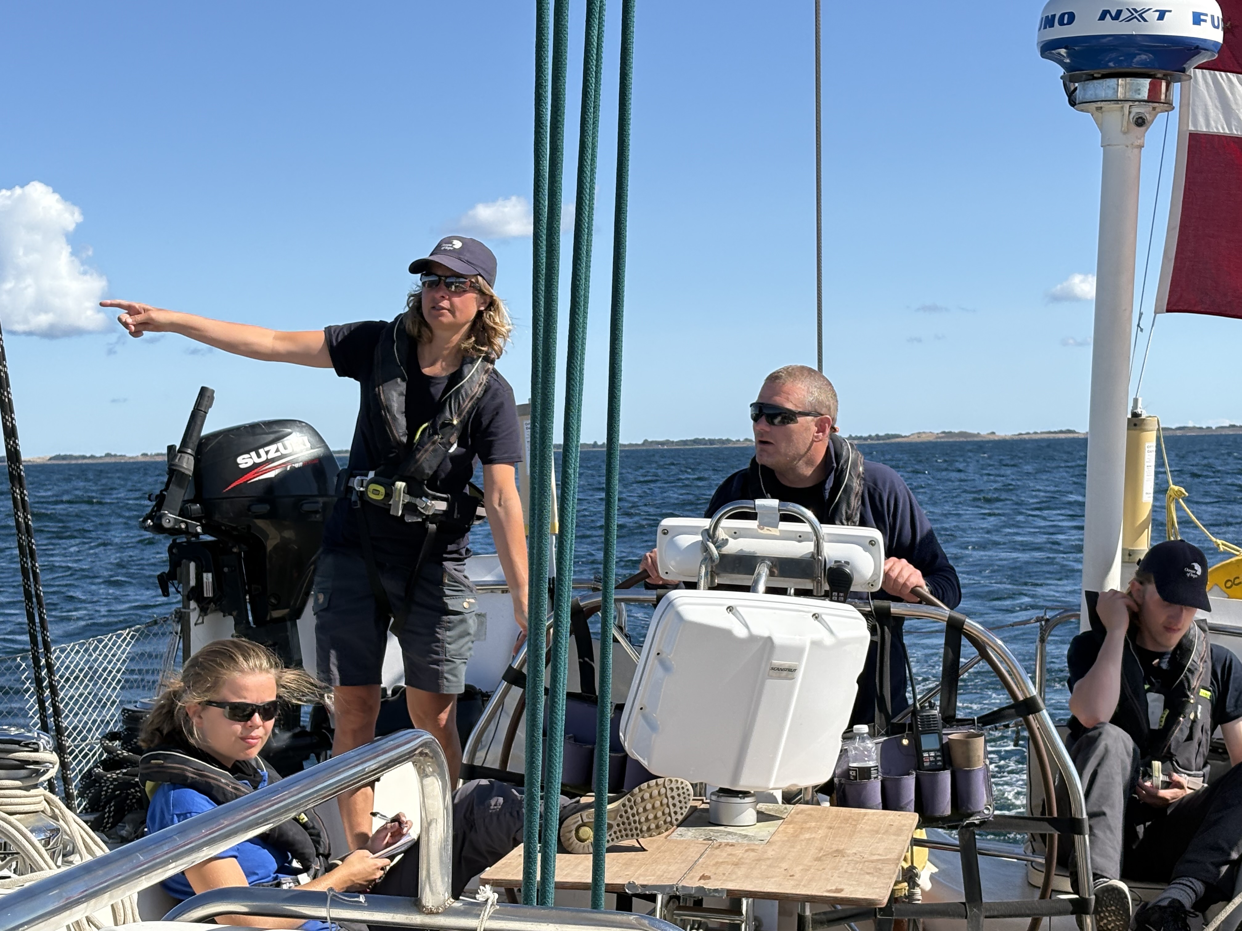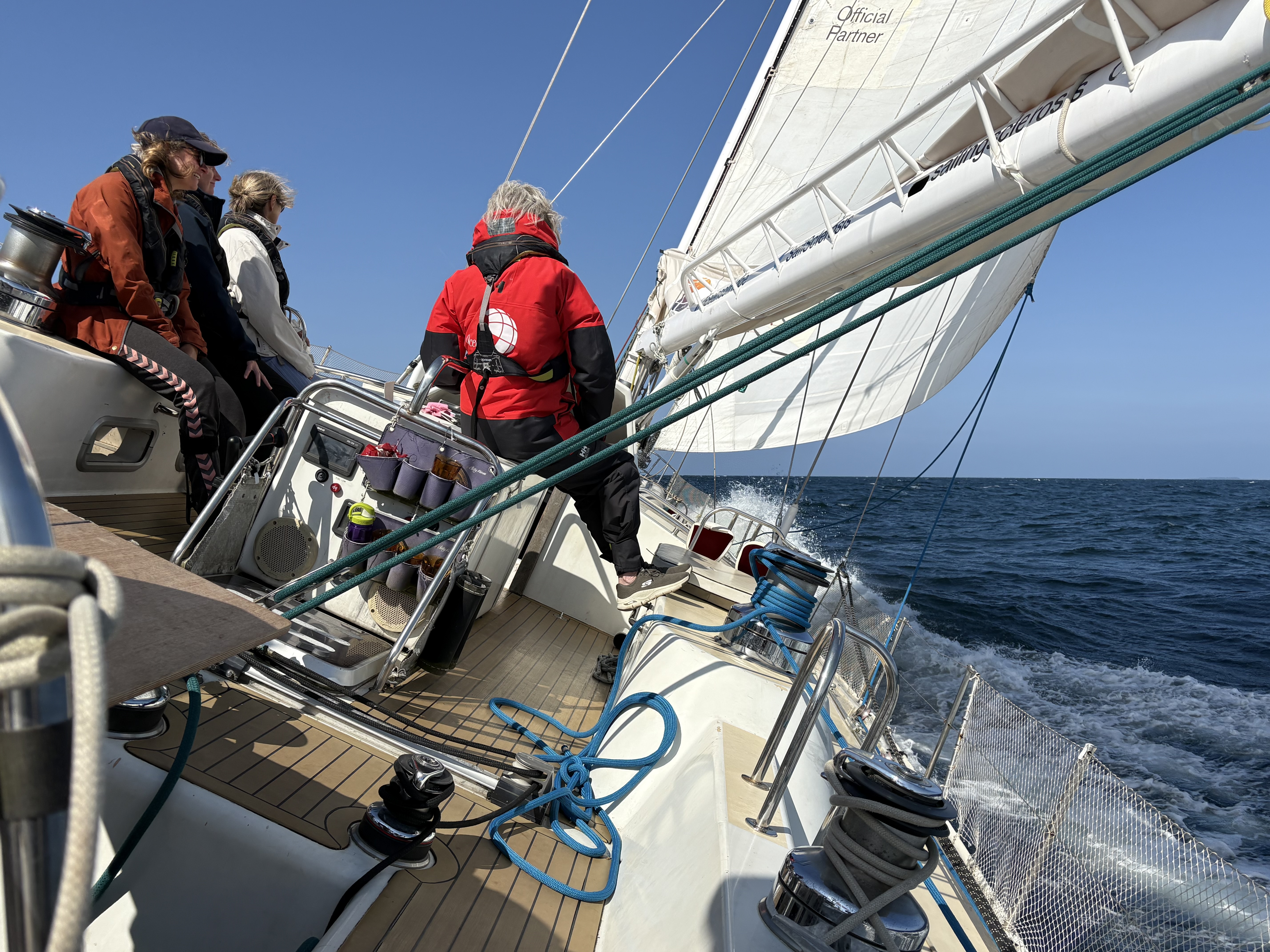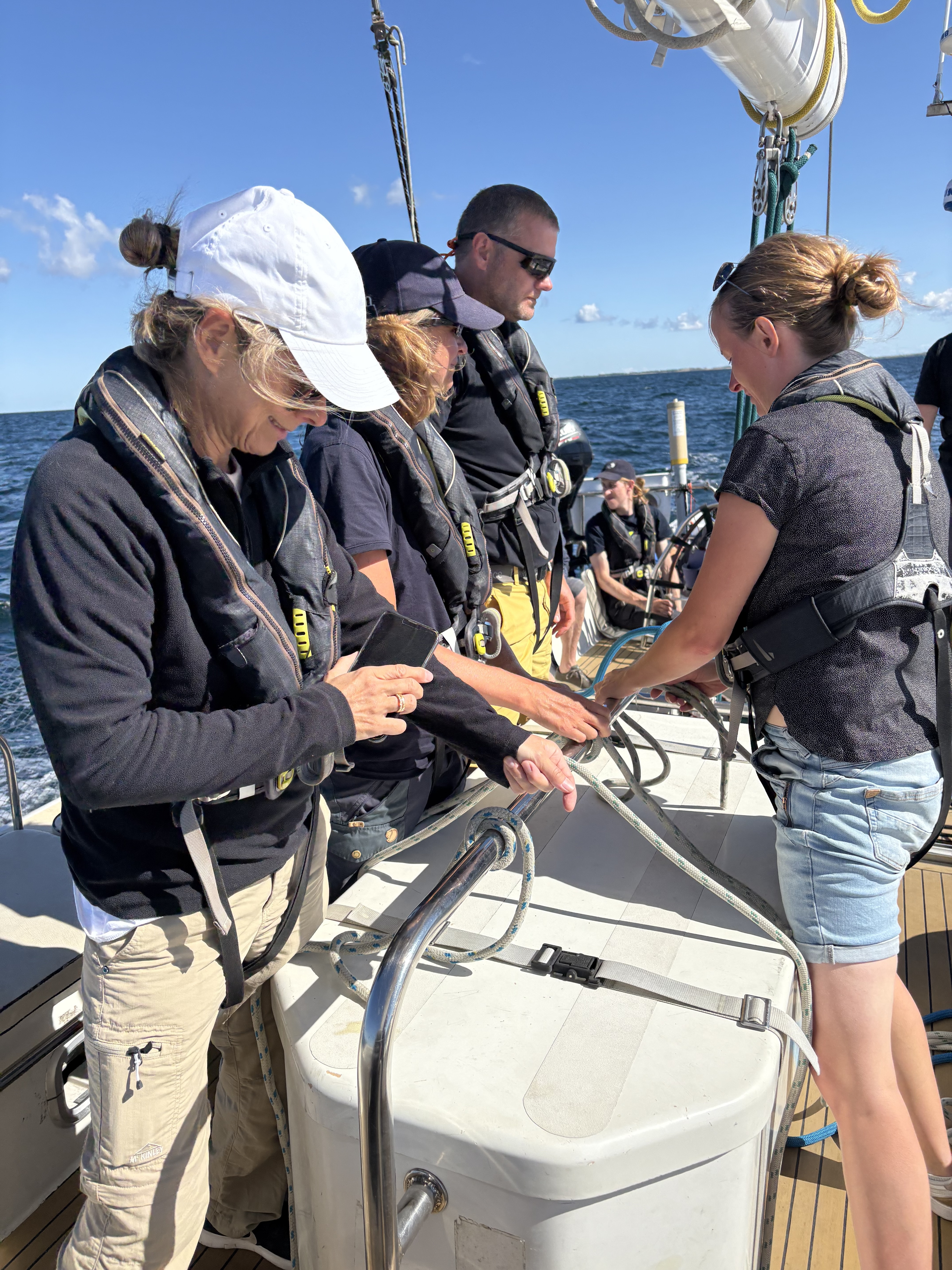 Med god vind i sejlene og åbent hav kom der efterhånden rigtig godt gang i båden, og frokosten, der var sat frem i kabyssen, måtte sættes tilbage igen, da alle foretrak at blive på dæk. Der blev udvist forskellig stil, idet nogle sad ganske afslappede, nogle med blikket skarpt rettet mod horisonten og et par stykker lige måtte ofre lidt ud over rælingen. Men det var heldigvis ingen hindring for højt humør hele vejen rundt. Da vi kom rundt om Røsnæs, kom der mere ro på båden, så der blev smurt håndmadder og sendt rundt.