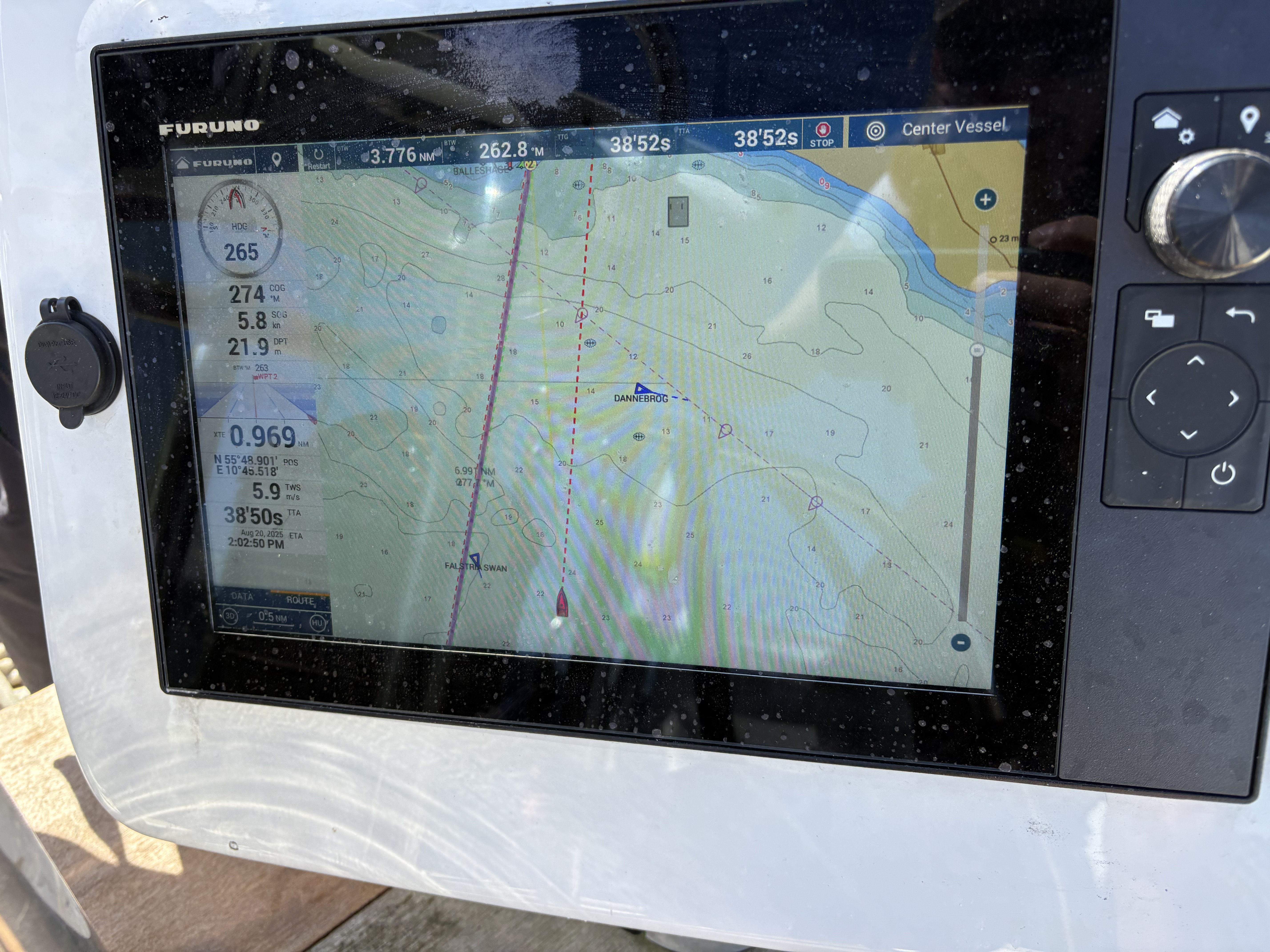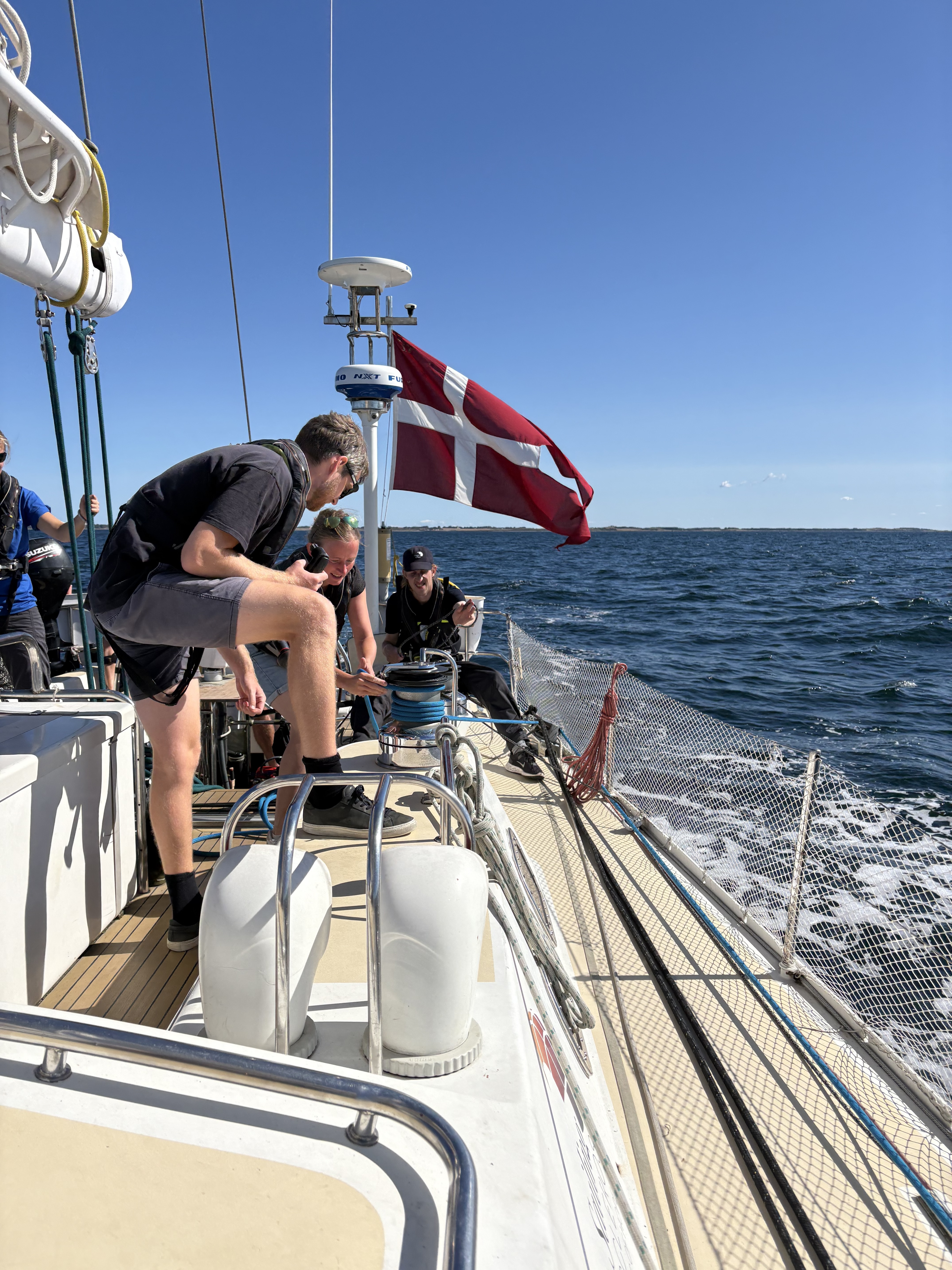 Igen igen var vi heldige med højt solskin og god vind, og alle mand hjalp til med at sætte sejl. Vi fik diskuteret regler for færdsel på havet og for rundsendelse af fyldte chokolader, mens vi forgæves forsøgte at indhente Dannebrog.